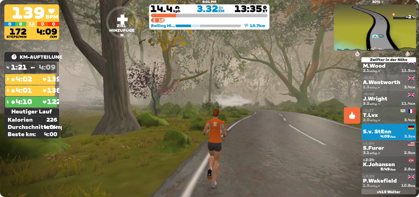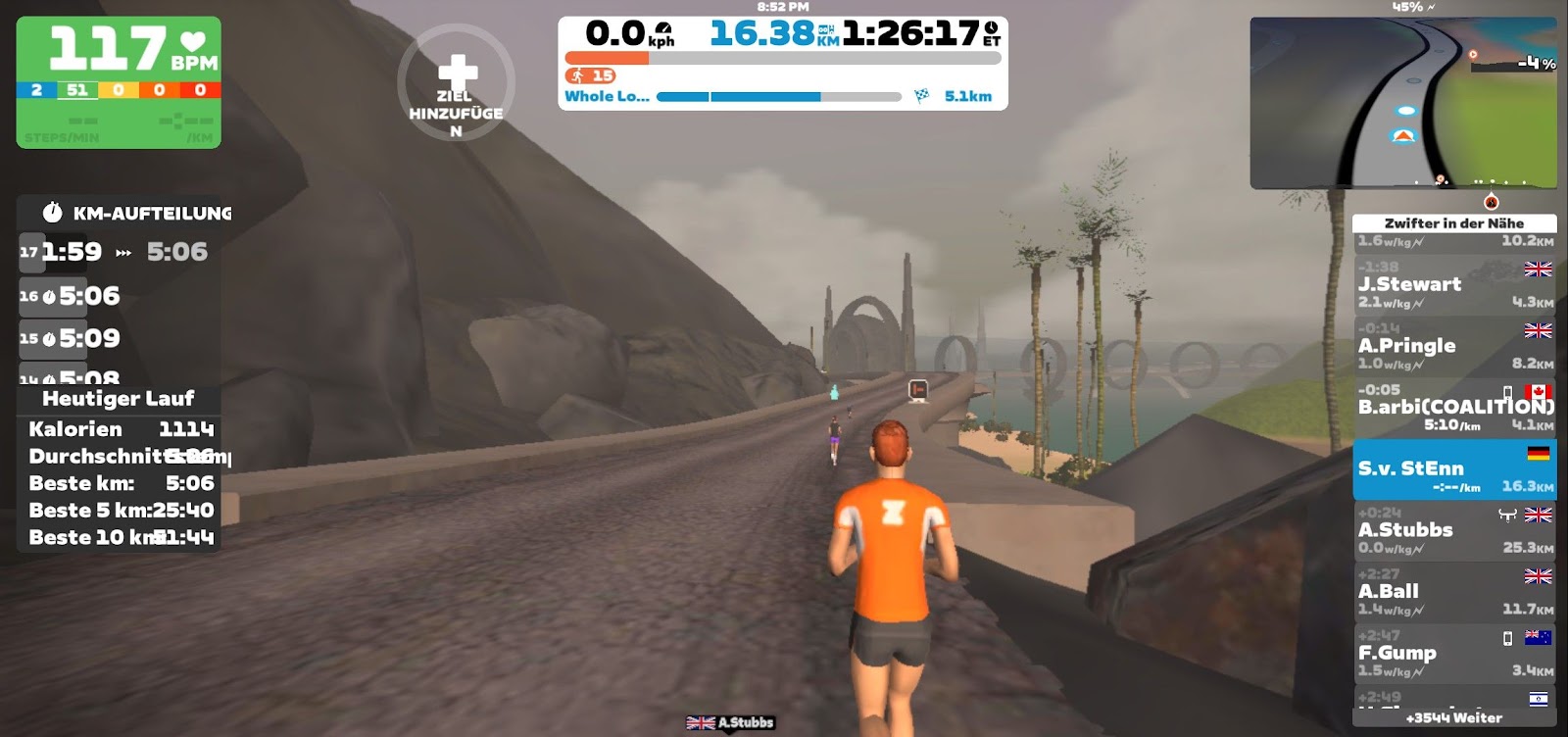 Meine Stirnlampe schmollt und funktioniert nicht mehr. So bin ich nach Watopia ausgewichen und bin da gelaufen.