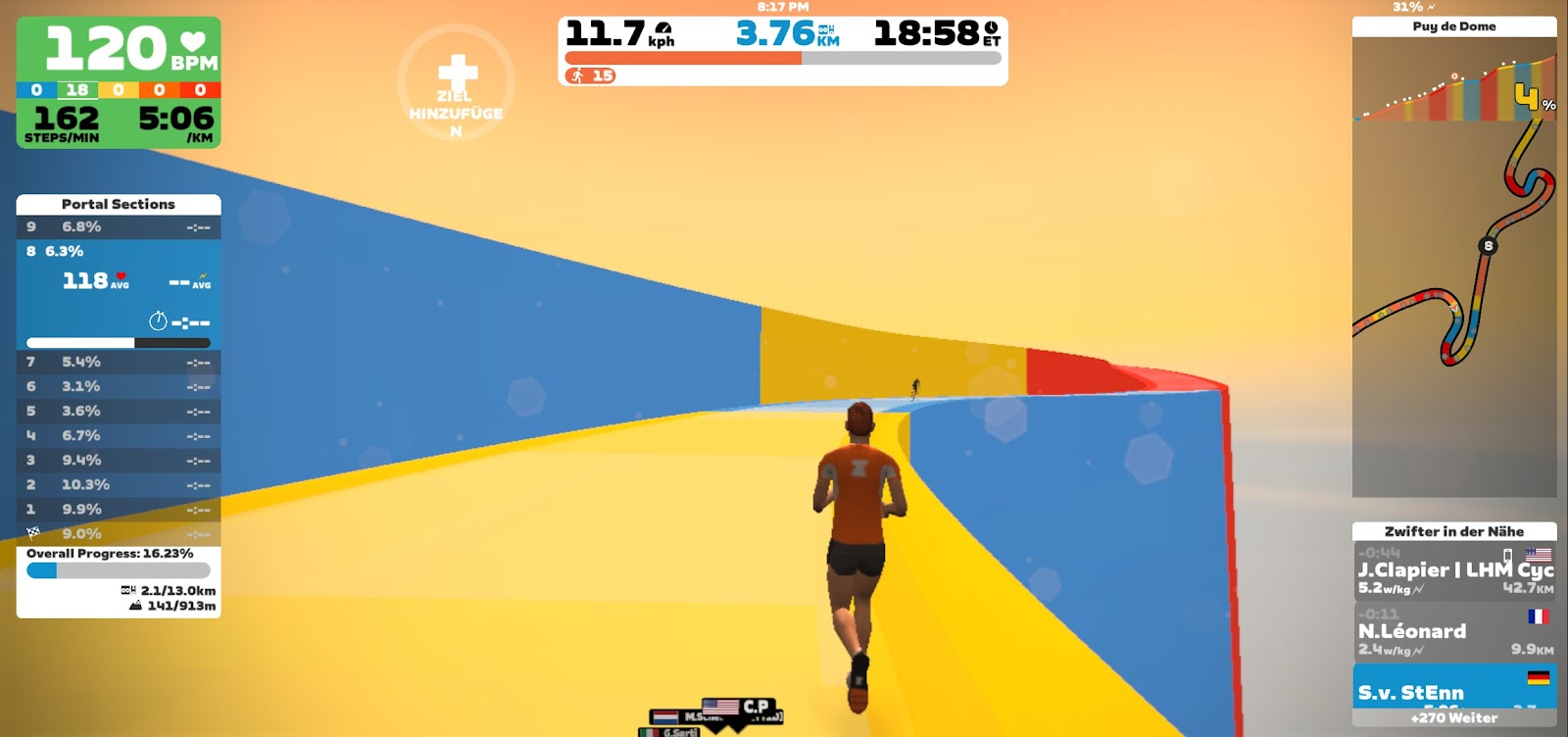 Bei dem Wetter habe ich mich sehr auf meine Laufbandeinheit gefreut. Im warmen, trockenen und vor allem hellen Sportpark Zwickau war es ein fest, durch das virtuelle Frankreich zu laufen. Aber die Animation auf dem Climb Portal: Puy de Dome in France war sowas von öde, dass es nur wenig Spaß bereitete, die virtuelle Welt anzuschauen.
