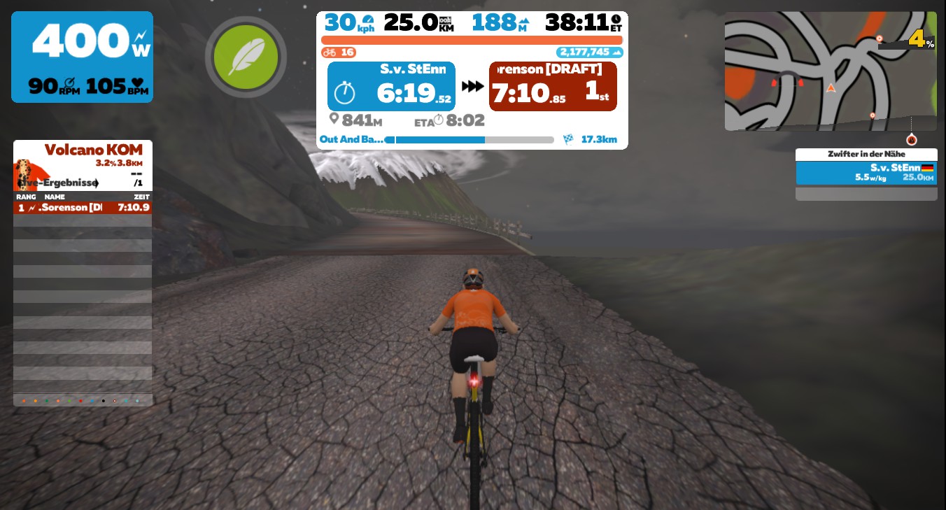 Ich hatte auf meiner Baustelle den ganzen Tag Kraft- und Stabilitätstraining. Der Gipskarton ist verschraubt, fast alles das erste Mal verspachtelt. Der Fliesenleger hat sich die ganze Geschichte angeschaut und für den Anfang des kommenden Jahrs zugesagt. Das waren die wichtigen Punkte am Samstag. Ganz ohne Sport ging es dann doch nicht. Ich bin noch eine Stunde durch Watopia geradelt, es war toll, den Vulkan hoch und runter zu erfahren.