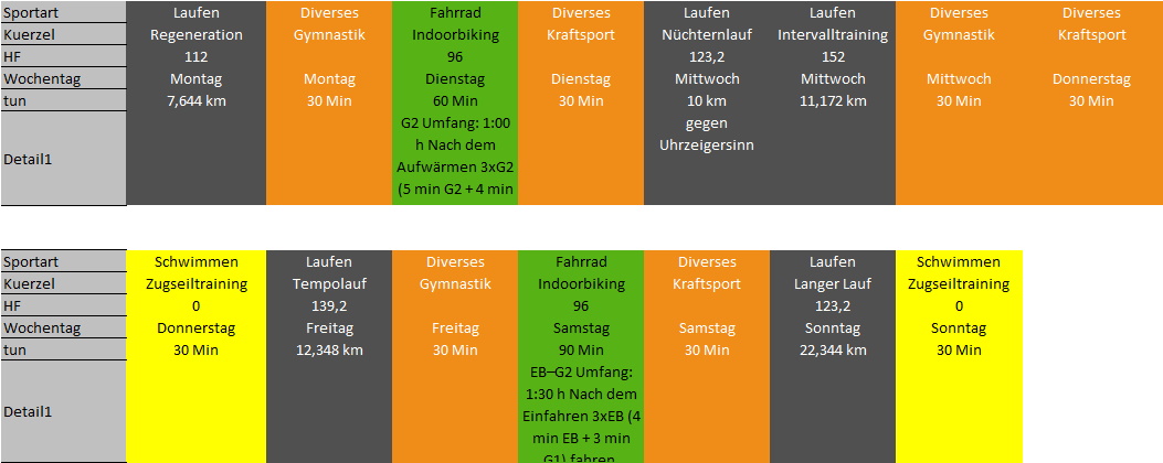 Durch die Arbeit und Schließung der Schwimmbäder kam mein Wochenplan ganz schön durcheinander. Leider schaffte ich auch oft das Dehnen bzw. Krafttraining nicht. Da werde ich in den nächsten Tagen mehr Wert darauf legen. Schön war mein Pyramidenlauf, einen entspannten Marathon gönnte ich mir.