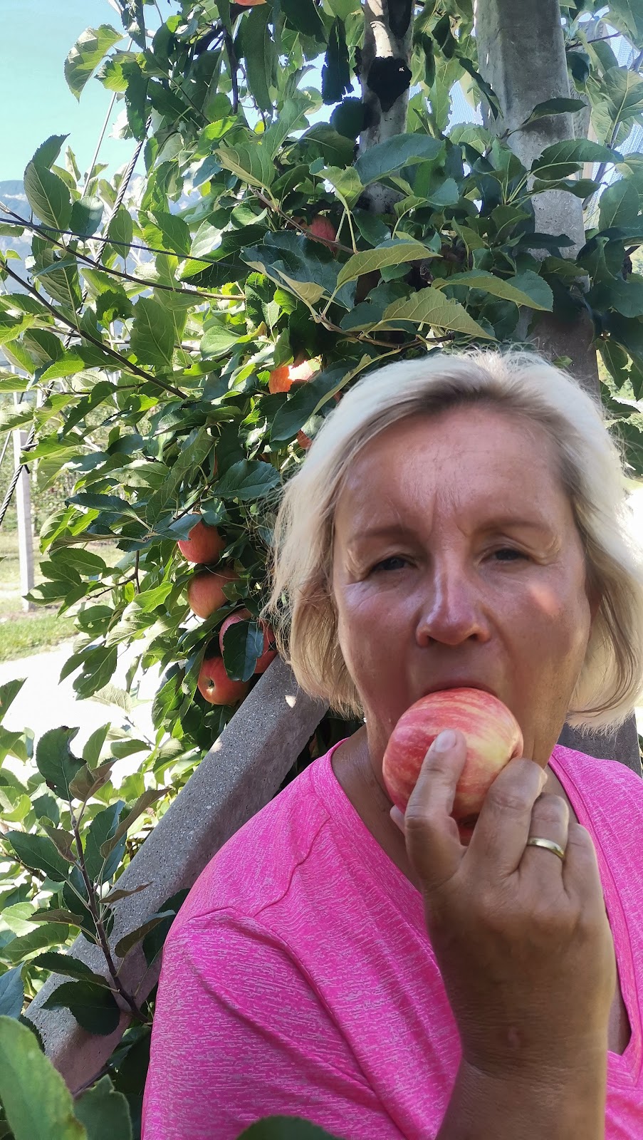 Anschließend gab es noch ein kitschiges Startbild, dann verließen wir sofort Descenzione und auch den See. Die Landschaft änderte sich komplett. Aus der alpinen Berglandschaft würde es lieblig hügelig. Das begleitete uns auch den ganzen Tag. Die Landwirtschaft war kleinzelliger und auch vielfältiger. Wir hatten am Wegesrand Apfel und Birnenplantagen, Weinberge, Mais und bereits abgeerntete Getreidefelder und zu unserer Überraschung auch ein Areal mit Kiwis.