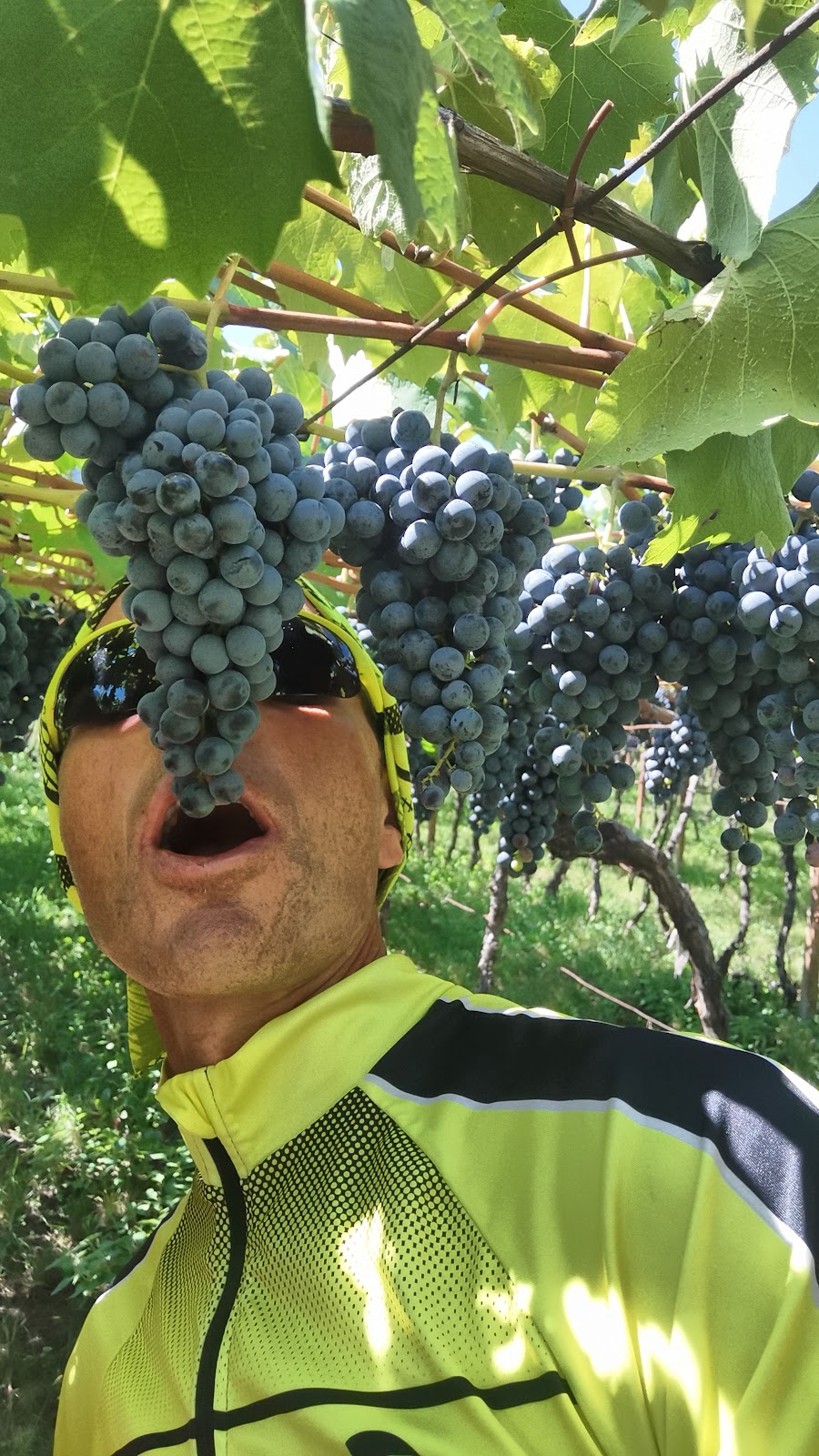 Interessant waren die Erntemaschinen für die Weintrauben, die die riesigen Felder abernten. Für mich war es heute auch zweimal anstrengend. Zwei längere Anstiege mit etwa 10% Steigung bewältigten wir. Aber wo es hoch geht, rollt es sich auch wieder gut runter.