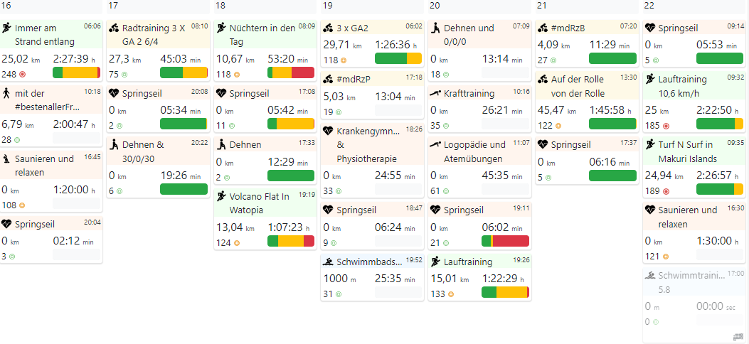 Um mein Training, die Ernährung und sonstiges reflektiert zu betrachten, blicke ich auf meine vergangene Woche zurück. Ich verbessere mich, wenn ich auf den vergangenen Zeitraum zurückblicke, die Lehren aus nicht so funktionierendem ziehe und aus den gelungenen Aktionen mich motivieren kann.