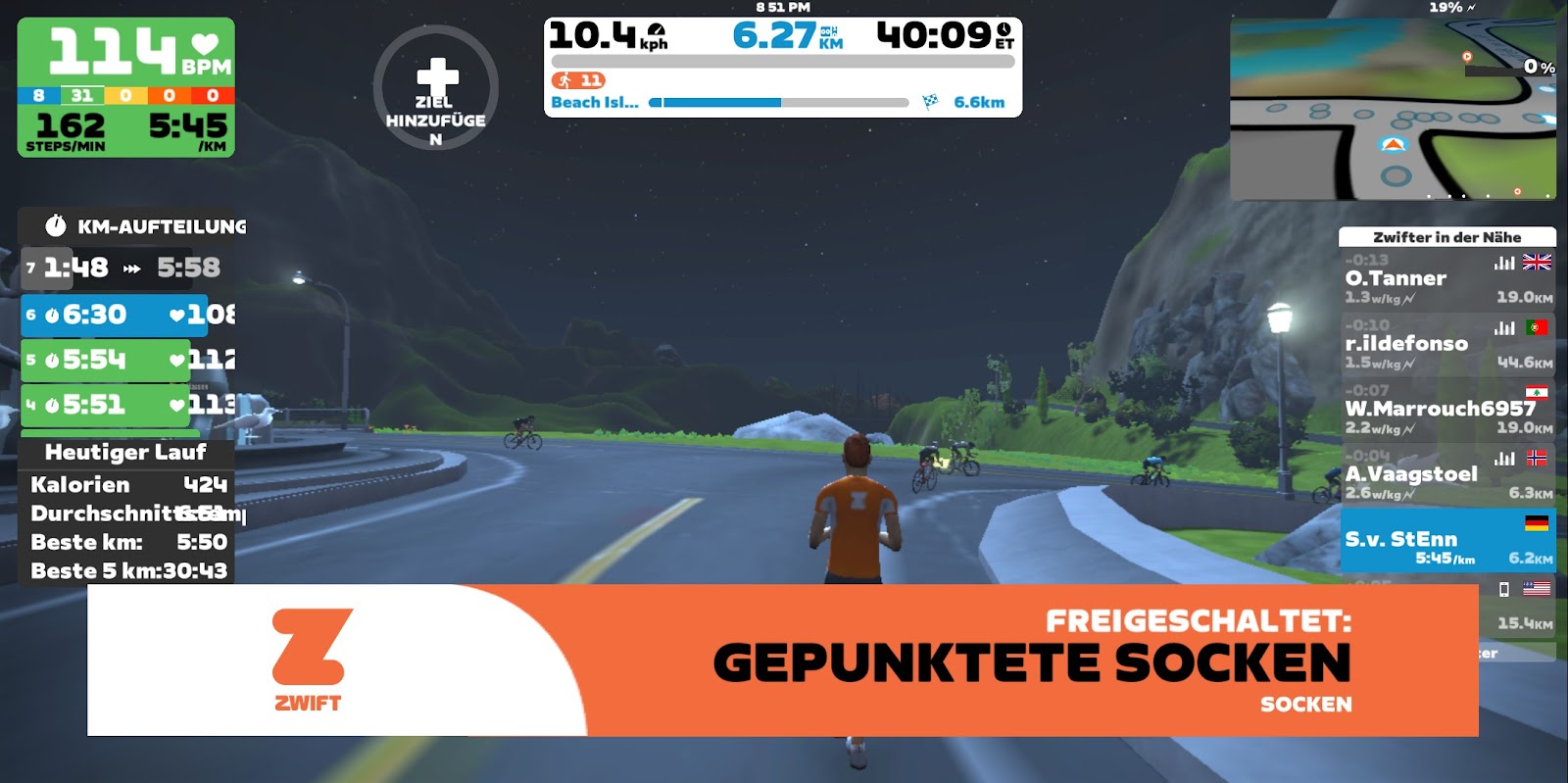 Den Tempolauf absolvierte ich auch diese Woche auf dem Laufband mit Zwift. Es ging durch Frankreich, das ist sehr empfehlenswert.